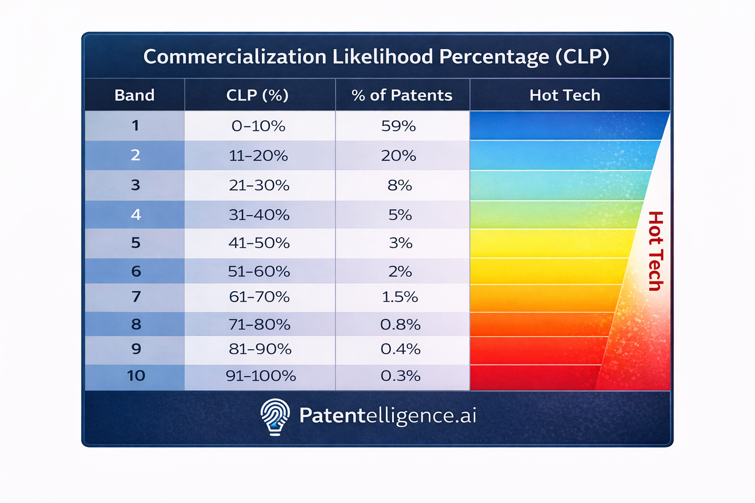 CLP is a likelihood indicator designed to estimate how likely a patent or invention is to produce commercialization outcomes such as licensing, productization, or monetization leverage.